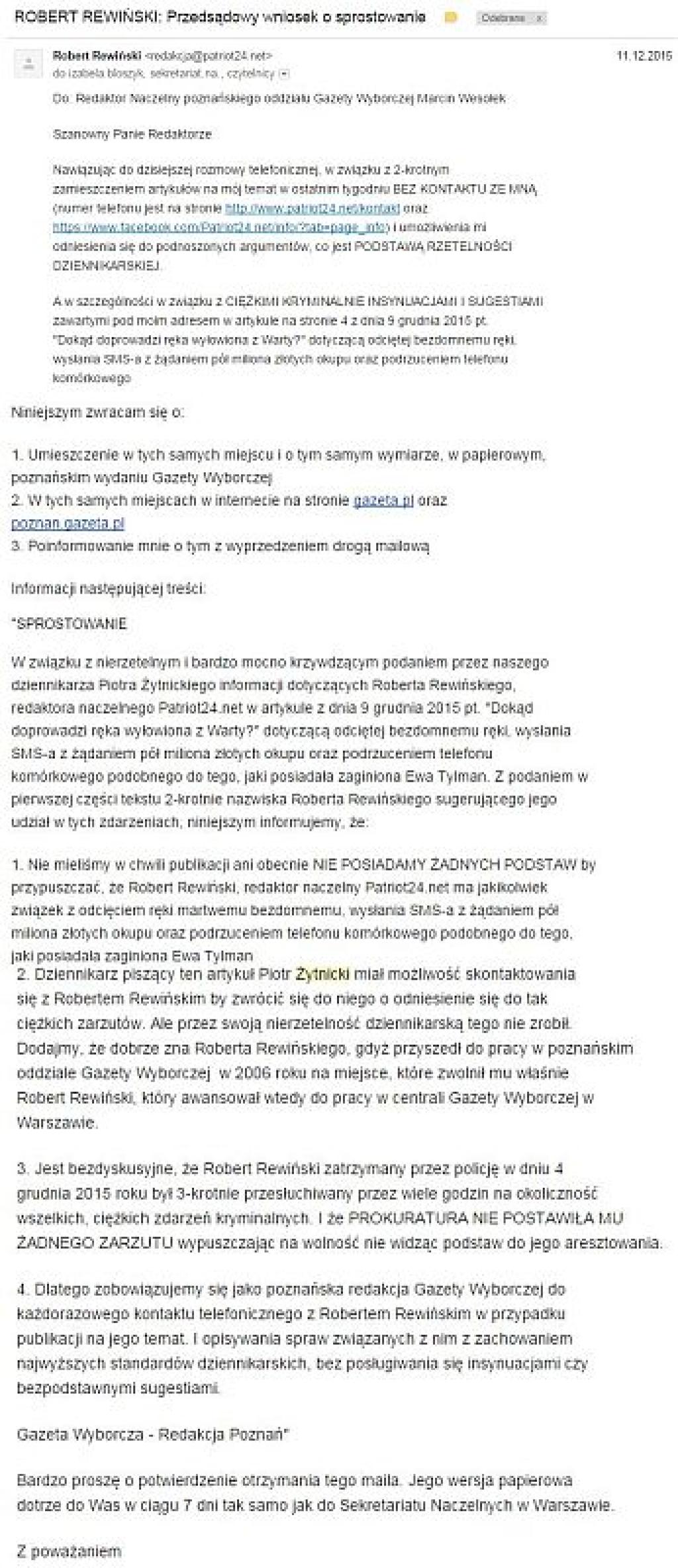 - Piotr Żytnicki to nierzetelny dziennikarz. 9 grudnia 2015 roku napisał ohydną insynuację w stylu bolszewickim, że miałem związek z odcięciem i podrzuceniem ręki do rzeki Warta w Poznaniu. Oraz podrzuceniem jakiegoś telefonu podobnego do tego jaki miała zaginiona oraz z wysłaniem SMSa z żądaniem pół miliona złotych okupu - tłumaczy Ronert Rewinski.